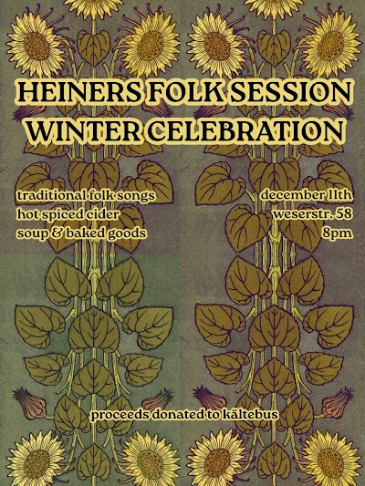 Concert. Traditional Folk Songs, Hot spiced cider, soup & baked goods. Proceeds donated to kältebus Weserstr 58 #heiners